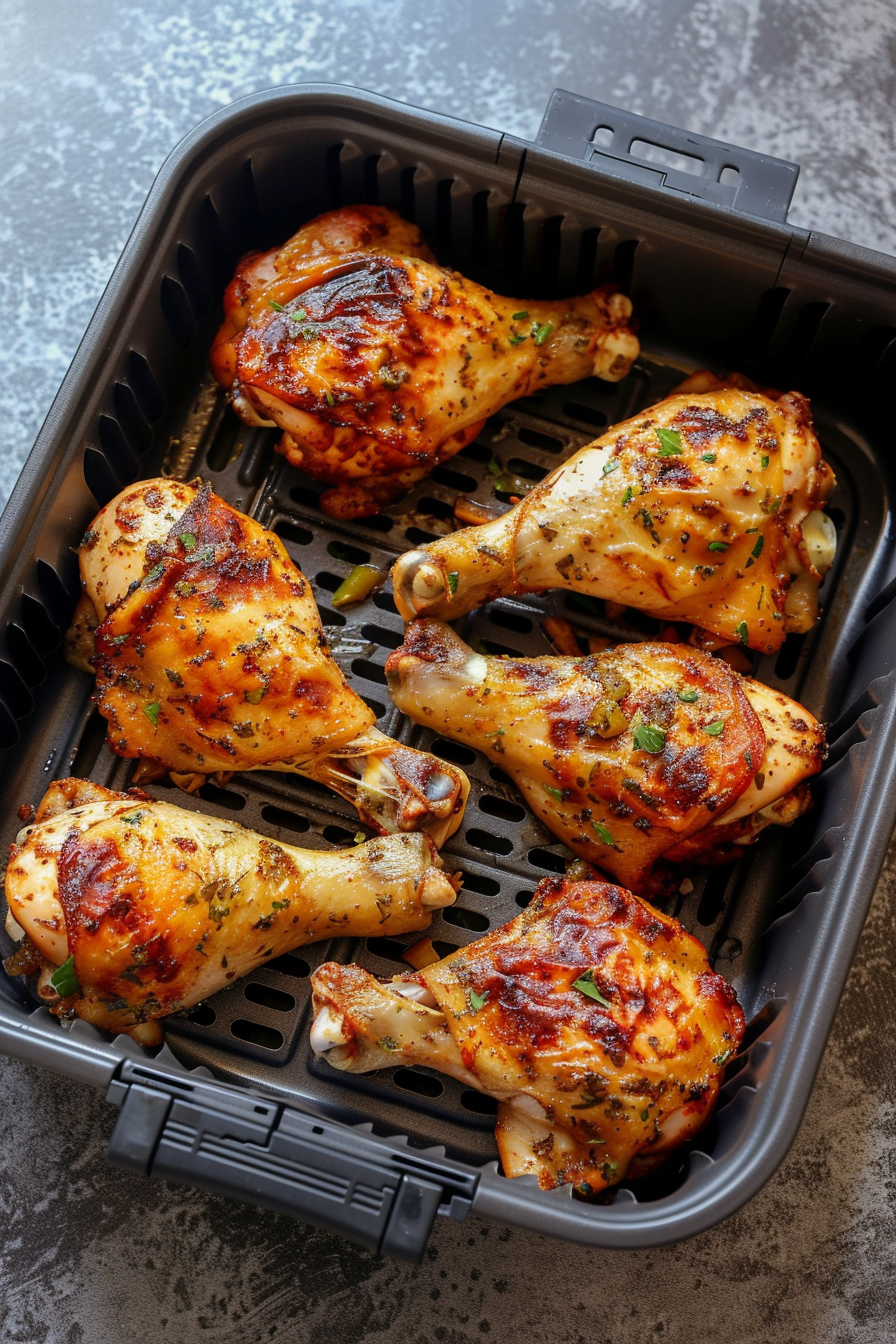 Place chicken in air fryer crisper first. Cook at 375°F for 12 minutes to form golden crust. Flip using tongs and cook 8 more minutes total.