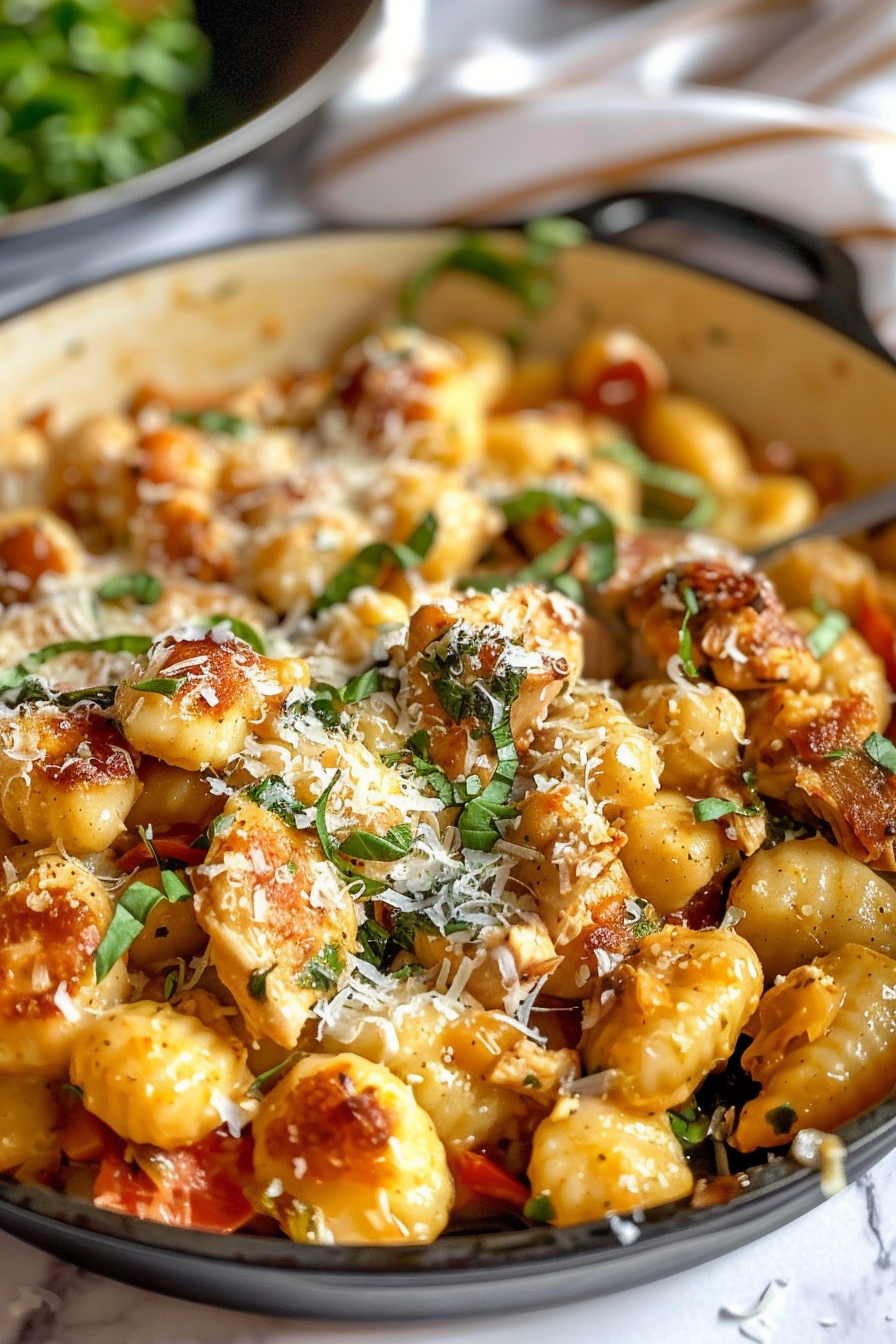 A creamy, garlic-laced one-skillet meal combining crispy chicken, pillowy gnocchi, and aromatic herbs. No heavy cream or wine—it’s a quick, comforting dinner with restaurant-quality results.