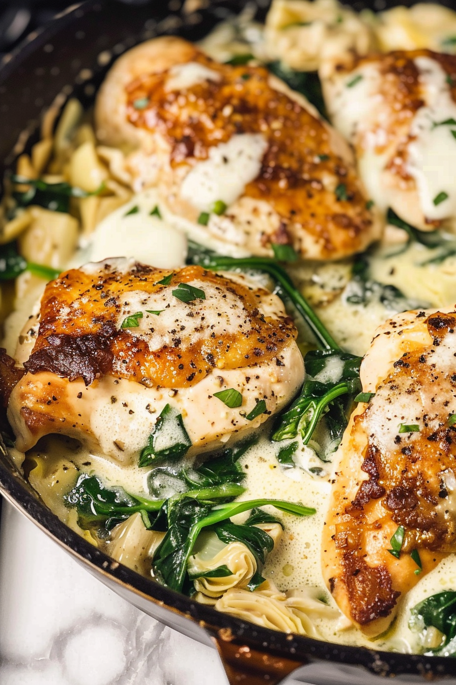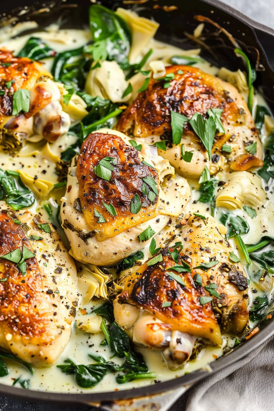 A vibrant, restaurant-quality dish combining tender herb-crusted chicken, roasted artichokes, and wilted spinach with a melty cheese topping. Ready in under 45 minutes using a single skillet for minimal cleanup, this hearty meal is gluten-free adaptable and keto-friendly with no alcohol or pork derivatives.